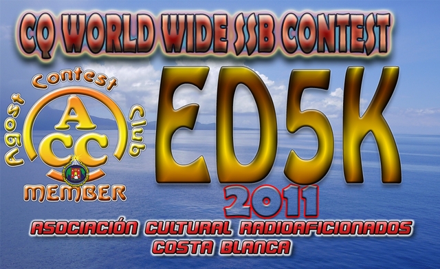 El pasado 29 y 30 de Octubre la Asociación Cultural Radioaficionados Costa Blanca, participó un año más en el concurso internacional CQ WW SSB Contest 2011, aunque este año no pudo ser en nuestra base de concursos de la ACC Agost Contest Club.  Participo en la categoría de Monooperador,  monobanda en 20m  baja potencia y , con nuestro indicativo para concursos ED5K. Esperemos que para Marzo de 2012  podamos seguir haciendo todos los concursos desde la ACC, aunque también estamos preparando algo en nuestra Sede de la ACRACB para otro tipo de concursos .