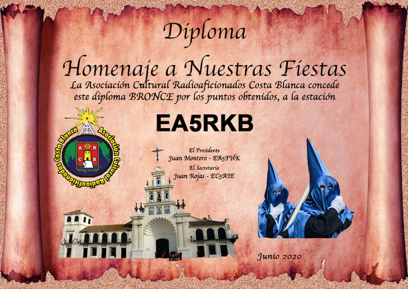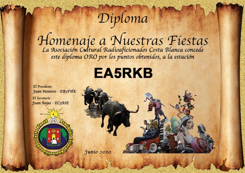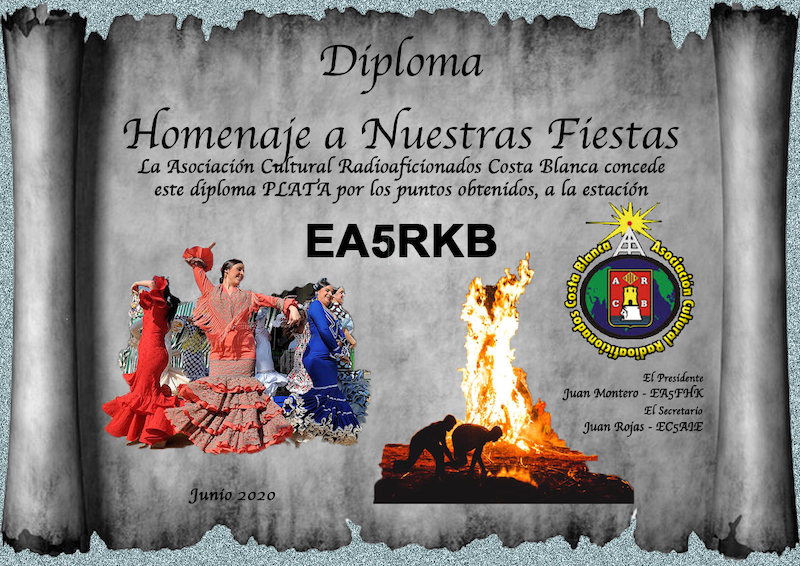 Desde la Asociación Cultural Radioaficionados Costa Blanca, y debido a que todavía pasamos mucho tiempo en casa, hemos pensado poner en marcha un nuevo diploma, para recordar algunas de las fiestas y actividades que este año no se han podido celebrar debido a la pandemia, pero que no hemos olvidado, como han sido las Fallas de Valencia, Semana Santa, Feria de Abril, Cruces de Mayo, El Rocío, Hogueras de San Juan, San Fermín, y un largo etc de ferias y fiestas patronales en cada municipio.