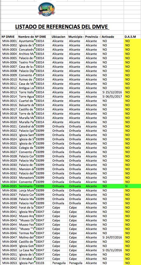 Una vez abierto, vemos las referencias del Diploma Monumentos y Vestigios, en la parte derecha y en amarillo te hemos marcado en esta imagen  las referencias DASM en color amarillo, como ves pone en todas NO, menos en una MVA-0035, que SI, es una referencia para el diploma Abadias de San MIguel.