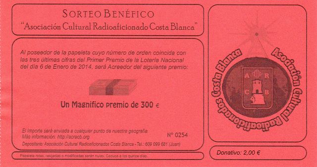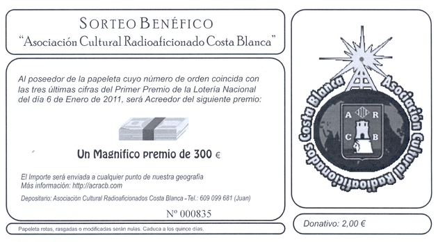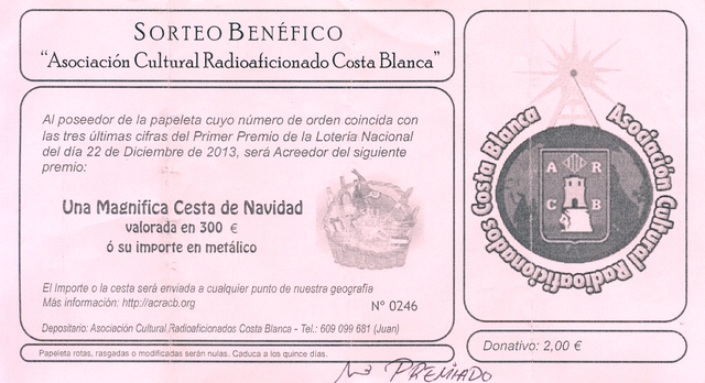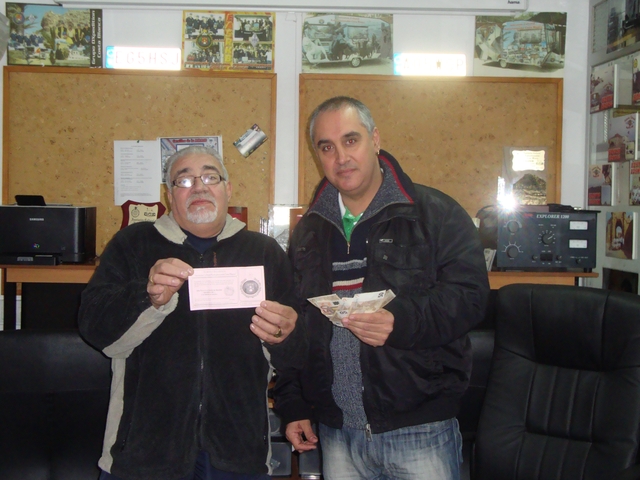 Jesús Macaya recibió los » 300 € » del premio de la rifa de «Navidad», de mano Fernando EB5IPK (Responsable de la Asociación en ese momento), enseña la Papeleta premiada mientras Jesús muestra los 300€, Enhorabuena |