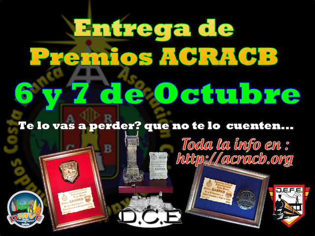 En esta ocasión haremos la entrega de los diferentes trofeos, Trofeos del Diploma Castillos de España DCE 1.0, Trofeos del Diploma Estaciones de Ferrocarriles Españoles DEFE 1.0 y Trofeos del Diploma de Monumentos y Vestigios DMVE 1.0, así como los ganadores del concurso de ACRACB en el Aire y Hogueras de San Juan.