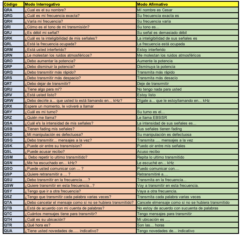 | QSY.- Cambio canal o frecuencia | QRA.- Nombre |
