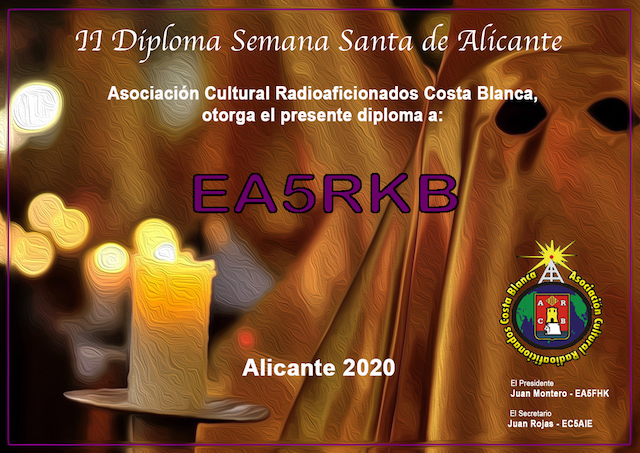 CB – Canal 18 USB (27.175 MHZ), en los segmentos recomendados por la IARU. Llamada: “CQ, II Diploma Semana Santa Alicante 2019”. Concurso: Cada estación colaboradora, otorgará 5 puntos.