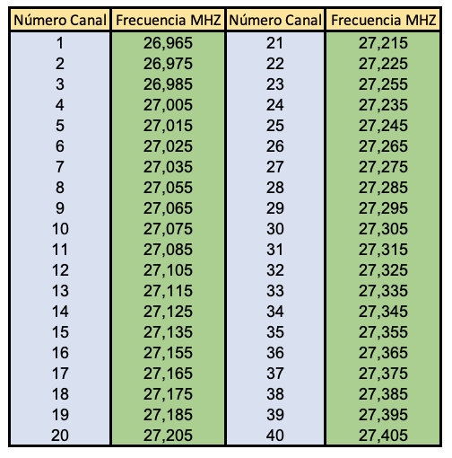 40 canales CEPT, comprendido entre las frecuencias 26.965-27.405 MHz.