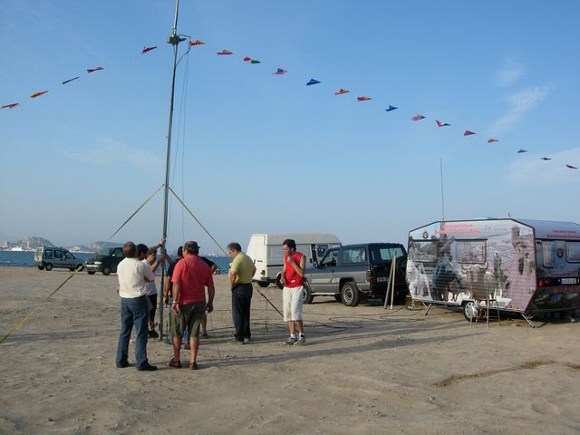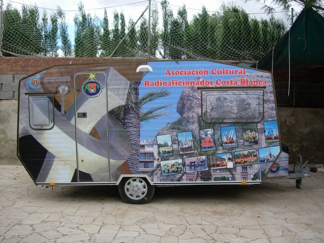 A las 5 salíamos de casa, llegábamos al punto, y muy organizados cada uno sabía perfectamente lo que tenía que hacer y como debía hacerlo, sin problemas ni discursiones. Dentro del camión montábamos las mesas rápidamente, cuatro caballetes y dos tableros, unos preparábamos los equipos, ordenadores, publicidad, etc, mientras otro grupo anclaba mástil, ajustaba el dipolo, y otro preparaba antena bibanda para salir también en 144 Mhz, en menos de media hora, todo listo para salir al aire. CQ, CQ, Trofeo Torres y Fortalezas de Alicante…